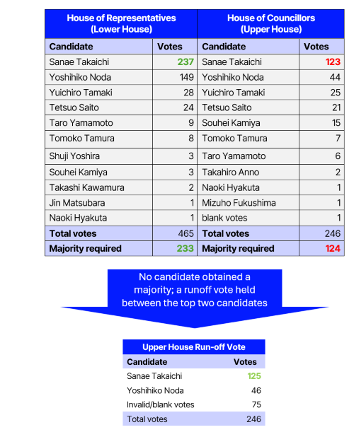 In the House of Councillors, Takaichi received 123 votes in the first round—one short of a majority—prompting a runoff. She then won the second round with 125 votes, securing her appointment by both chambers. Opposition parties split their votes, with the Constitutional Democratic Party supporting its leader Yoshihiko Noda, while Komeito, the Democratic Party for the People, and others each backed their own candidates, resulting in a fragmented opposition showing.